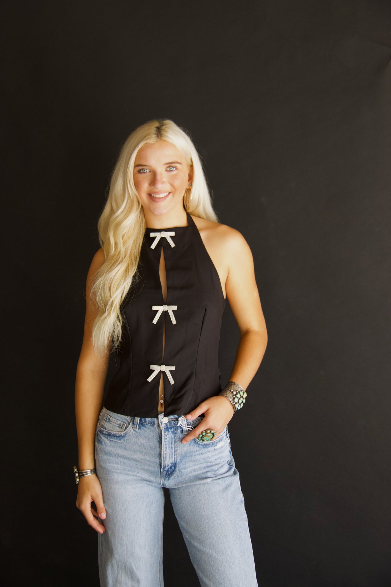 Rhinestone bows halter top, zipper on the side